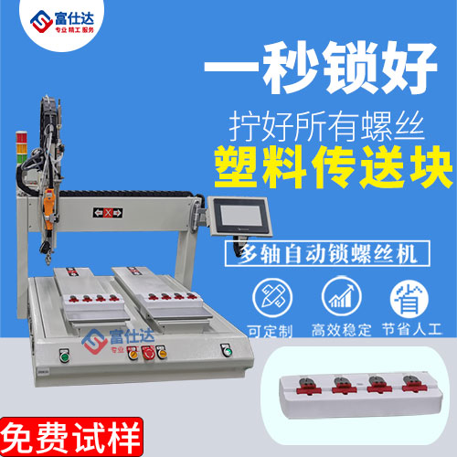 塑料傳送塊表鎖螺絲設(shè)備,產(chǎn)品是產(chǎn)品是用在工廠里面的設(shè)備上 正面有4顆螺絲需要緊固,背面也通過4顆螺絲緊固,