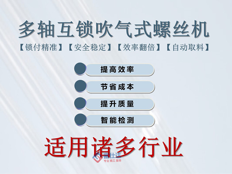 設(shè)備主要由自動送釘機(jī)、多軸鎖付系統(tǒng)、多工位作業(yè)臺、機(jī)械手臂等機(jī)構(gòu)組成,根據(jù)產(chǎn)品螺絲數(shù)量定制多軸鎖付系統(tǒng)及自動送釘數(shù)量,達(dá)到一次輸送并擰好所有螺絲的效果,大幅提升效率,簡化工序。