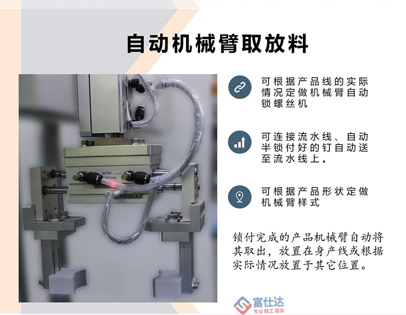 帶機(jī)械手臂自動鎖螺絲設(shè)備,是富仕達(dá)專業(yè)為企業(yè)流水線生產(chǎn)設(shè)計的多軸式自動鎖螺絲機(jī),充分體現(xiàn)了設(shè)備的可定制性,設(shè)備通過機(jī)械手臂自動將擰好螺絲的產(chǎn)品抓取并放入流水線中,大幅簡化生產(chǎn)工序,節(jié)省人工。一次性可鎖50顆螺絲 一次性鎖付好